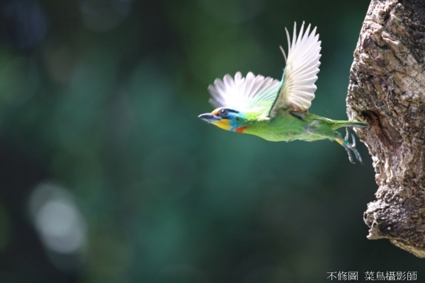 要拍飛行版,五色鳥是最夯的練習標的,可到植物園、中正紀念堂與大安森林公園試試。今年五色鳥築巢時間較晚,地點也沒有像去年那麼低矮,但還好的是有好的綠色背景;因為位置之故,讓我們可以順光拍也可以逆光拍,需要掌握的反而焦平面,如果沒有準確對焦,再好的展翅都沒用。