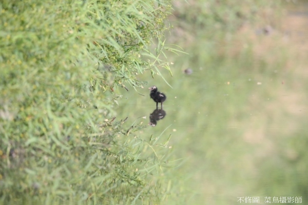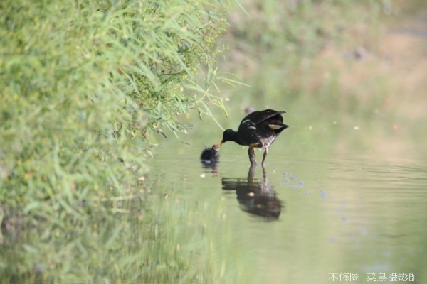 大園水田裡,紅冠水雞築巢其間;清晨剛從地平線露出的旭陽,斜角度漫射在親鳥身上,散發暖暖的母愛光輝。親鳥從夾豆草上刁下最軟嫩的夾豆,雛鳥揮動牠的小手迫不及待地品嘗,親膩的倒影說服一切美好。