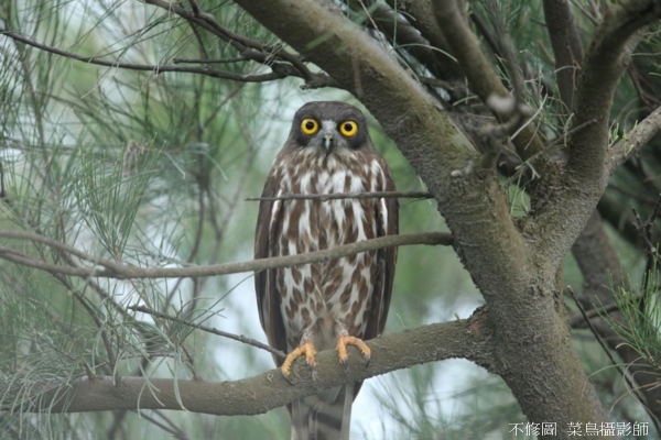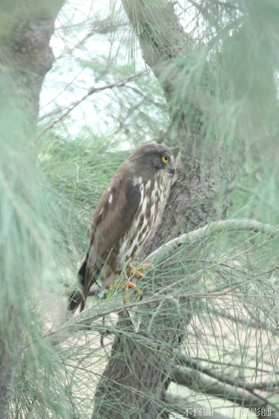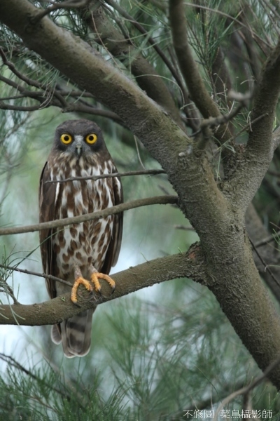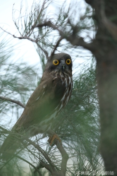 到達現場,發現在木麻黃密枝裡躲很大,但被一位鳥友驚嚇竟然飛上枝頭,得以拍到全身照,過程真是令人驚喜。大大的黃眼真是迷人,一付好無辜的模樣讓人憐愛;小小黑嘴,配上胸前灰白參半的紋斑,加上黃色腳站在哪,跟記憶裡的貓頭鷹一個樣,討人喜愛。