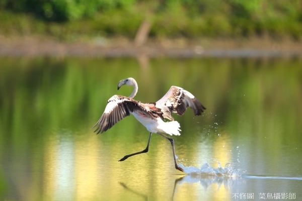 來自中亞或非洲的迷鳥紅鶴,找到宜蘭這個好山好水棲身,同樣吸引鳥友們的爭相競攝。早上趕去等飛版,那知只有小跑步版,突然起飛對焦點被前樹檔住,只好留下這個半切版來惕勵自己,別再犯錯。