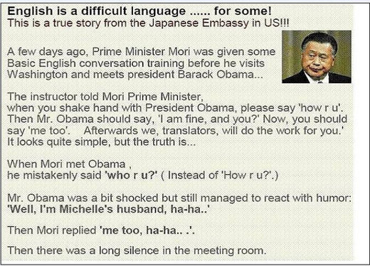 教師告訴首相Mori,「當你和歐巴馬握手時,請對他說:『How are you?』」,
