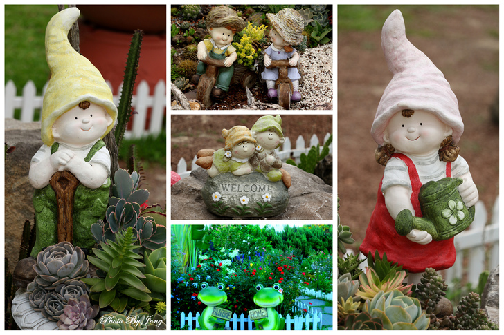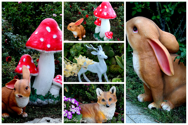 台北新生公園自闢建台北玫瑰園以來,或許傳承了過去在園區就在多處設立雕塑作品的風格,在玫瑰園區造景上也特別喜愛以花器、人偶或動物造型的陶製飾物來搭配花樹造景,其數量及變化遠多於其他園區,頗能增加園區的生動和趣味,也成了園區風格特色之一。