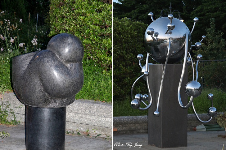 雕塑,春天的走向(楊柏林作)+飛機+鳥、希望(楊英風作)+悠遊歲月(于彭作)