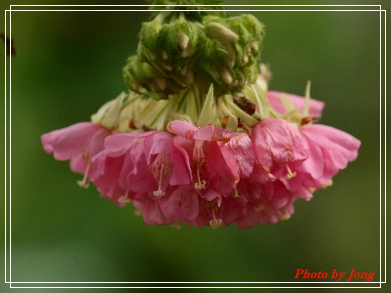 冬季開花,花期為 12 月至翌年 3 月。花腋生,懸吊著一個花苞;花為繖形花序,開花時會長出花軸,花軸下輻射出具等長小花梗的小花;一個花球可包含二十多朵粉紅色的小花,每朵小花有花瓣 5 枚,長約 3 公分,有一白色星頂狀雌蕊及多枝雄蕊圍繞;全開時聚生且懸吊而下,極像一個粉紅色的花球,其俗名吊芙蓉及Pinkball等名均由此而來。
