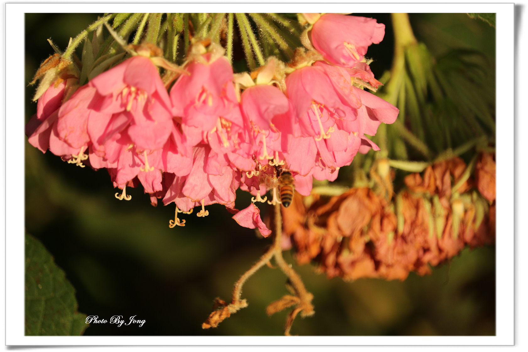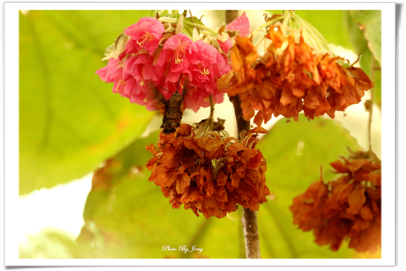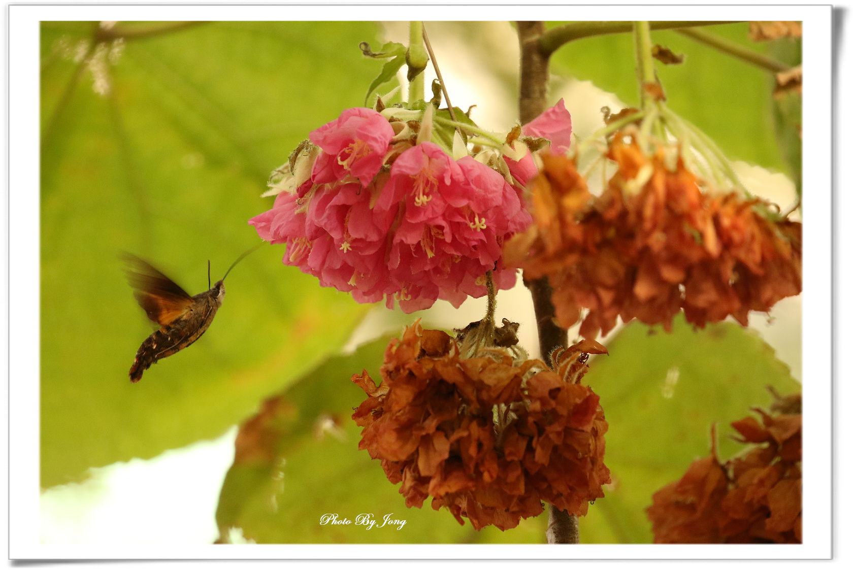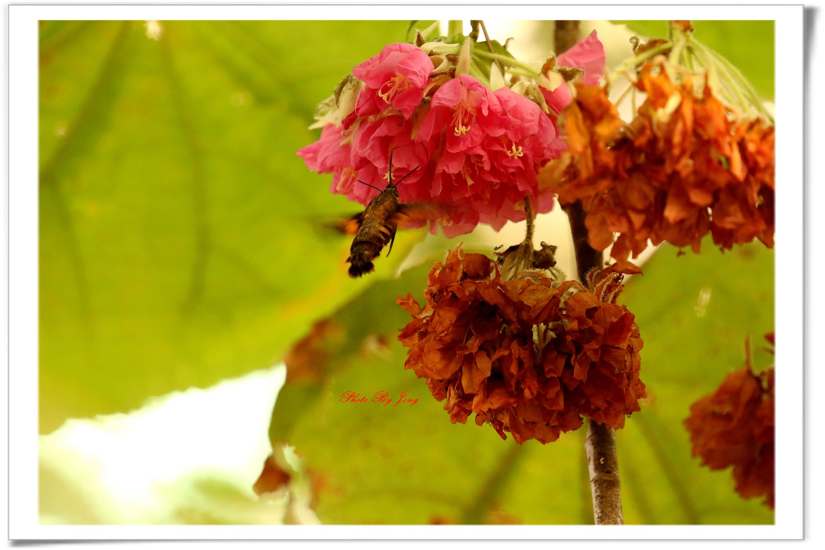 因為非洲芙蓉垂吊的大花球小花群聚,對蜜蜂、小長喙天蛾特別具有吸引力,因此,常會發現有蜂、蛾圍繞,忙著採食花蜜,更增添賞花的情趣。