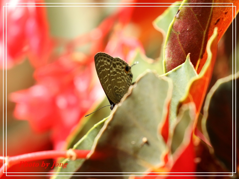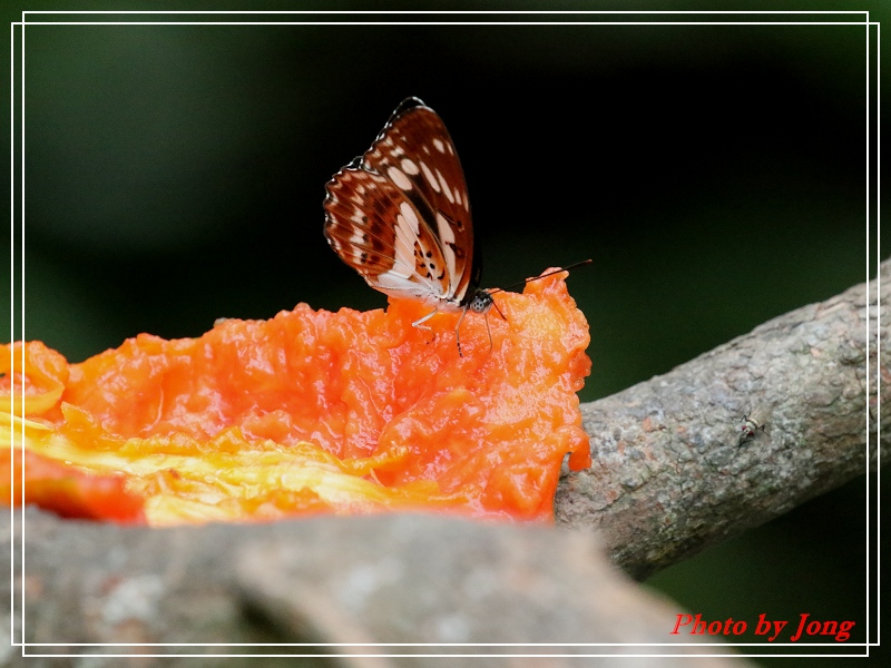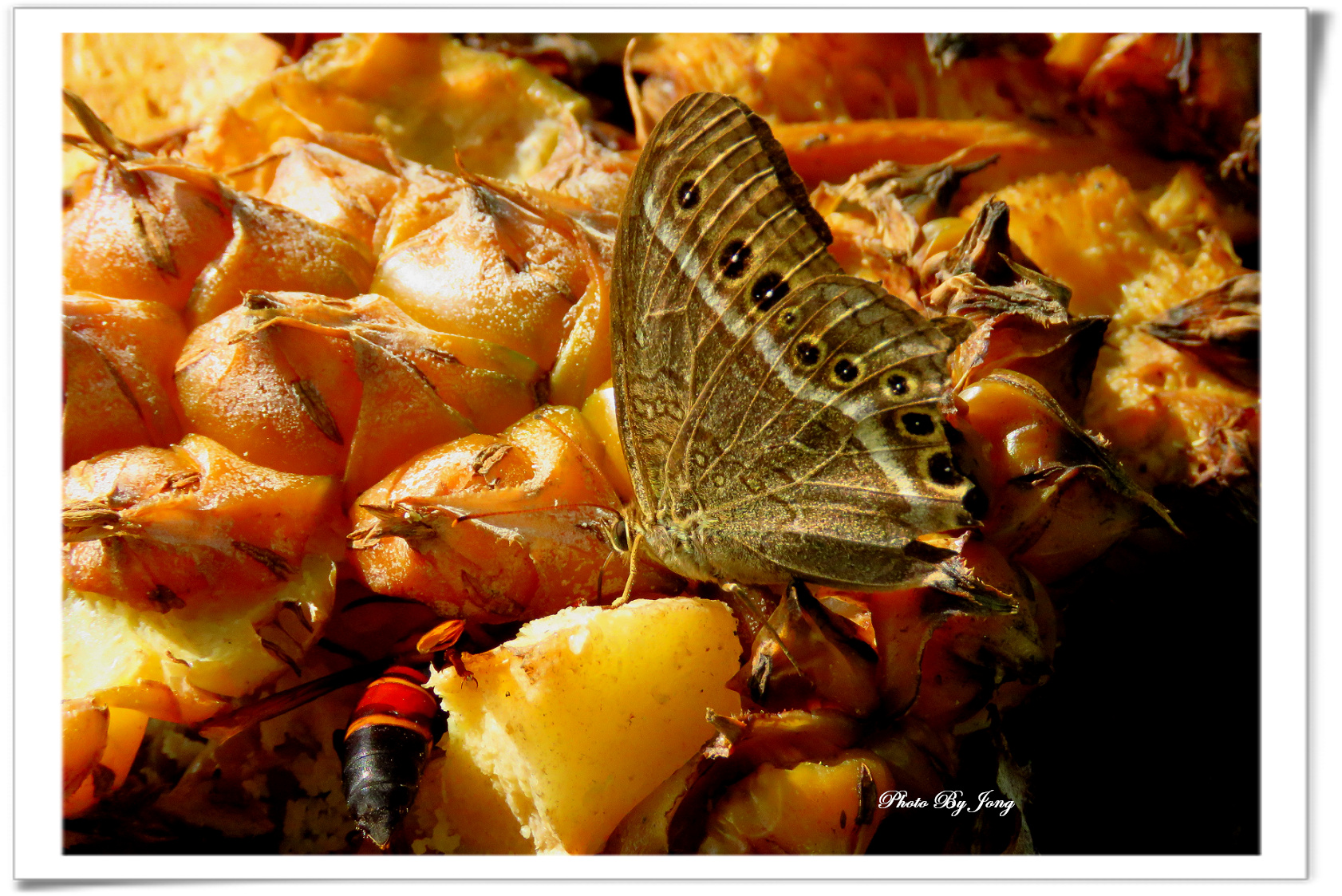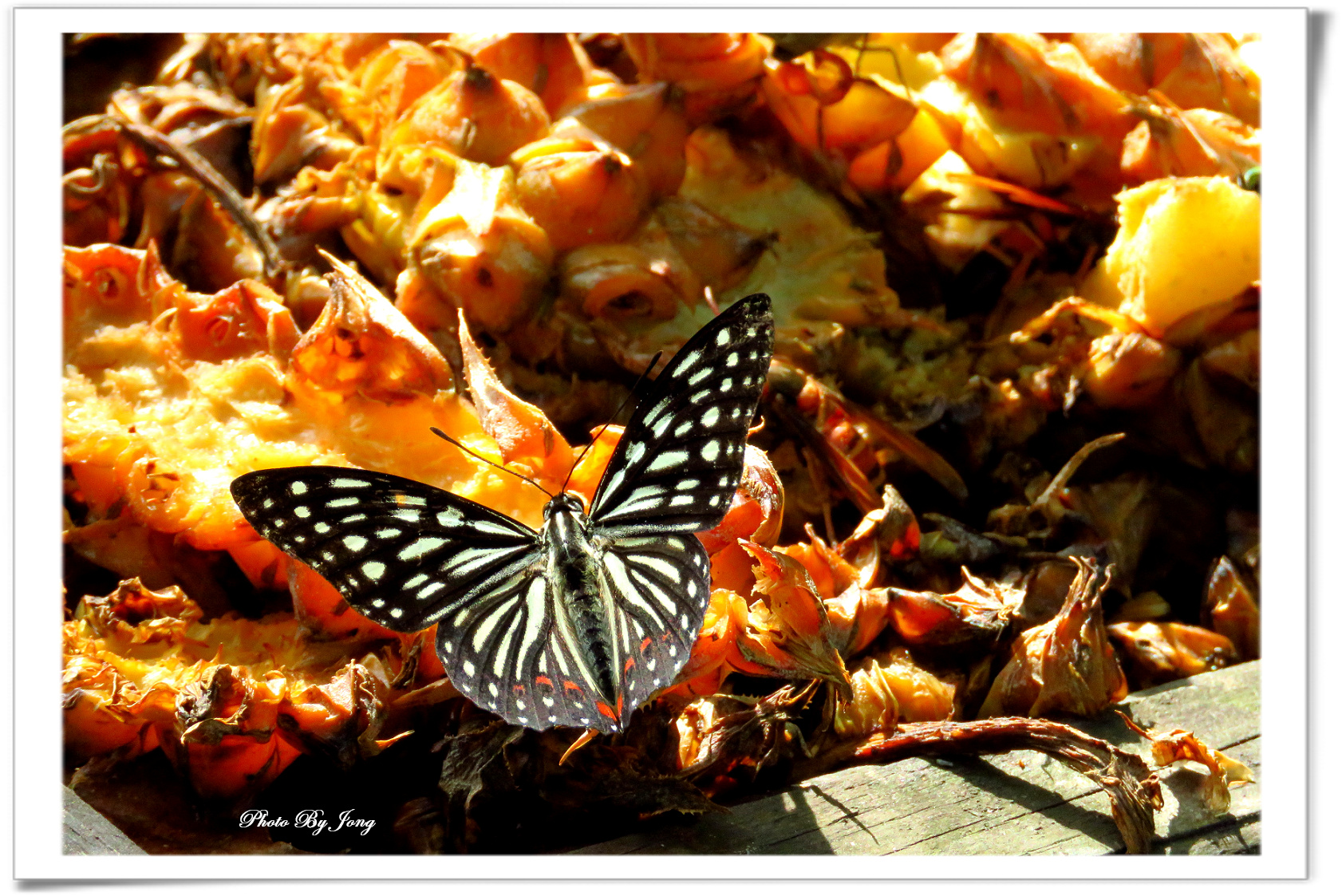 鳳梨果+紫蛇目蝶+台灣星三線蝶+異色尖粉蝶+永澤黃斑蛺蝶+紅星斑蛺蝶。