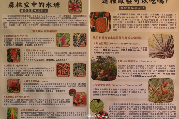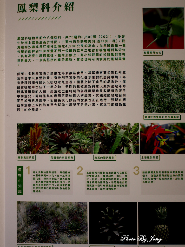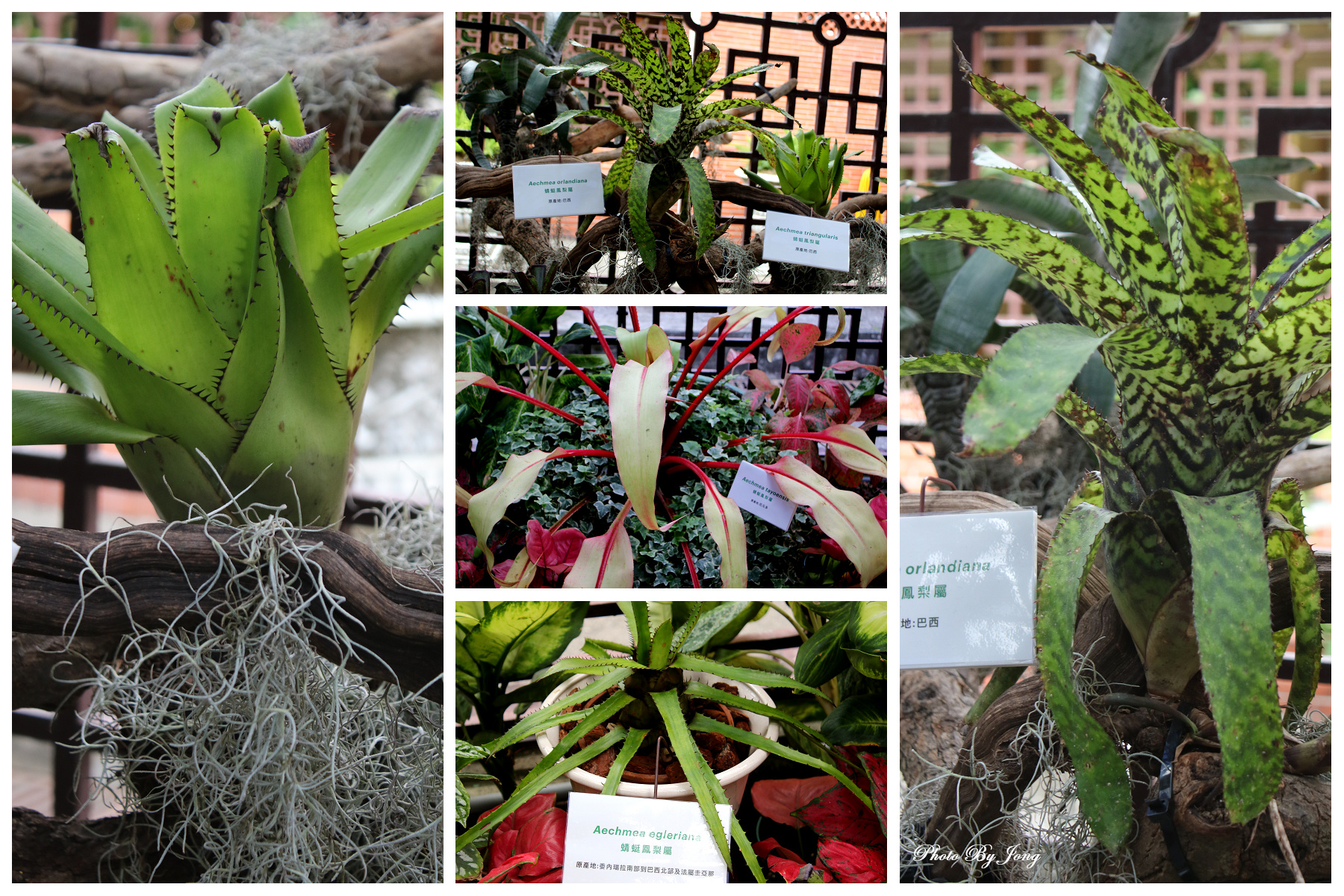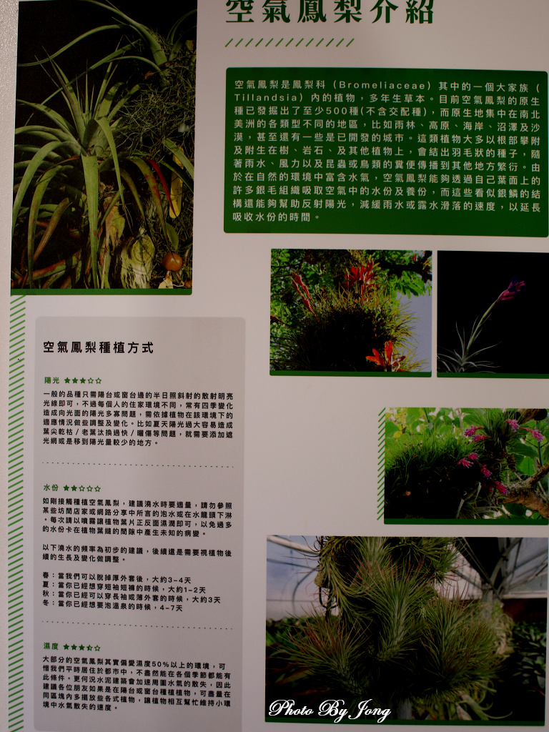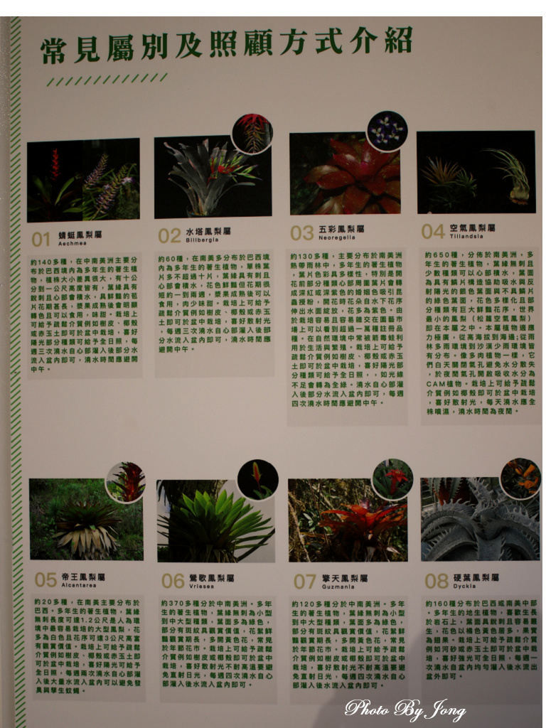 這次展出特別標示了鳳梨八類屬別及其照顧方式。八類分別為:蜻蜓鳳梨屬、水塔鳳梨屬、五彩鳳梨屬、空氣鳳梨屬、帝王鳳梨屬、鶯歌鳳梨屬、擎天鳳梨屬、硬葉鳳梨屬。