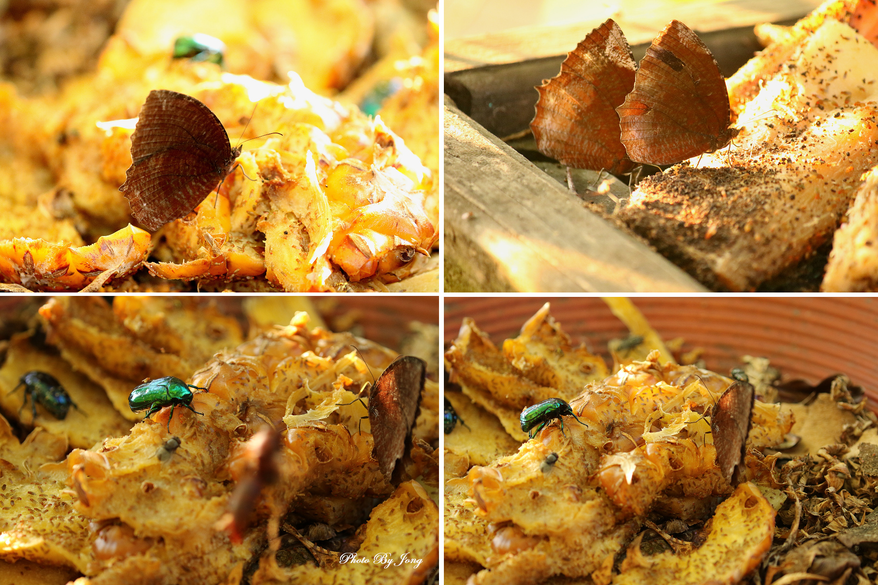 鳳梨花間+台灣藍鵲、厚葉鳳梨花+青條花蜂、鳳梨花+黃長腳蜂、鳳梨葉+大娜波灰蝶、鳳梨果+紫蛇目蝶+金豔騷金龜+枯葉蝶。