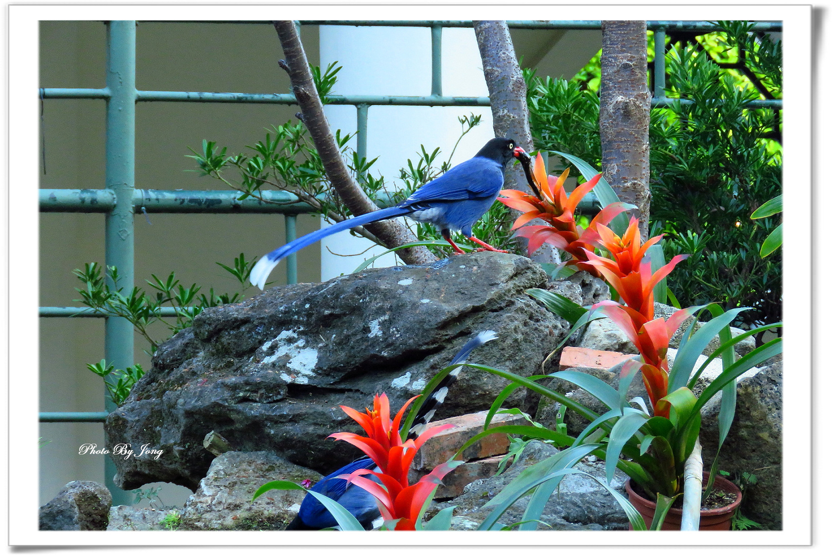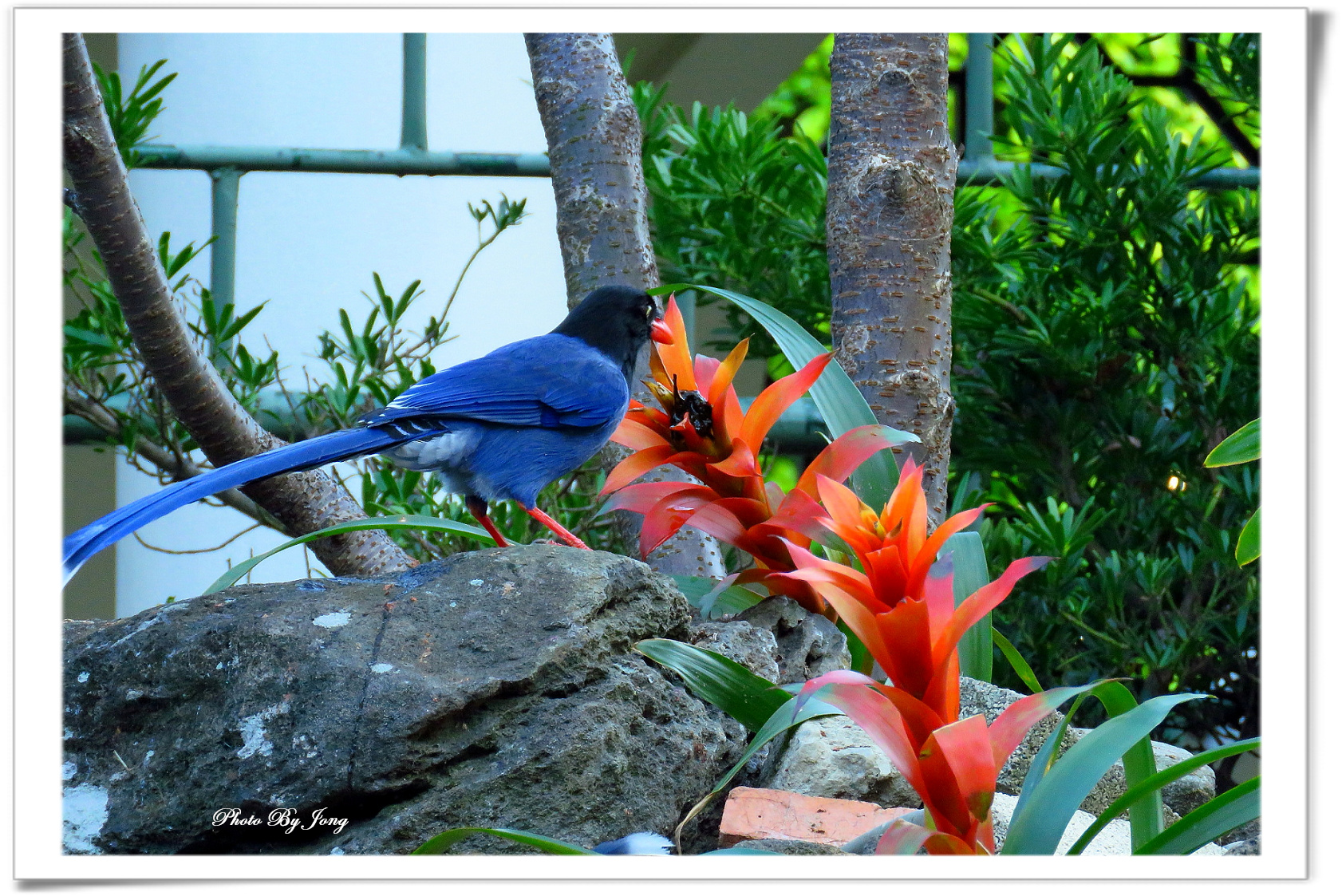 個人雖沒有探索頻道(Discovery Channel)及動物星球頻道(Animal Planet)上山下海搜奇的珍貴畫面,但在都會的諸多的園圃中也發現過台灣藍鵲、紅嘴黑鵯及蜂、蝶等昆蟲與鳳梨交會的機遇,野人獻曝,樂得在賞鳳梨之餘與同好們分享吧!