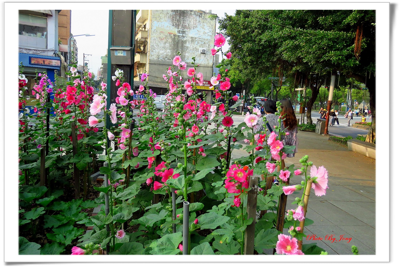 蜀葵花大又有型,有單瓣或重瓣花,且色彩豐富,乍見十分讓人驚艷注目。個人就曾在臉書引用,轉角/遇到蜀葵花~到士林官邸看花卉展,搭捷運,2號出口左轉,會經過一條寬巷子,整條巷子都是各具特色的餐廳,到中山北路口,轉角,驀然發現在車水馬龍的大路旁一畦特別精心栽種的蜀葵花圃,特別讓人感覺有意想不到的驚喜和小確幸喔!
