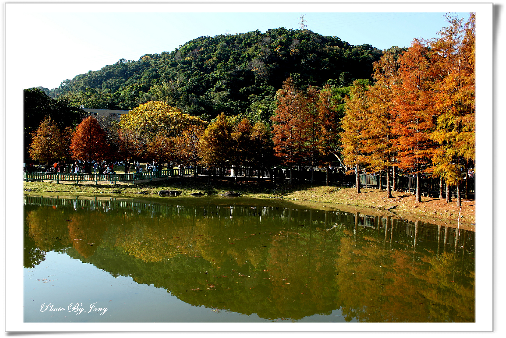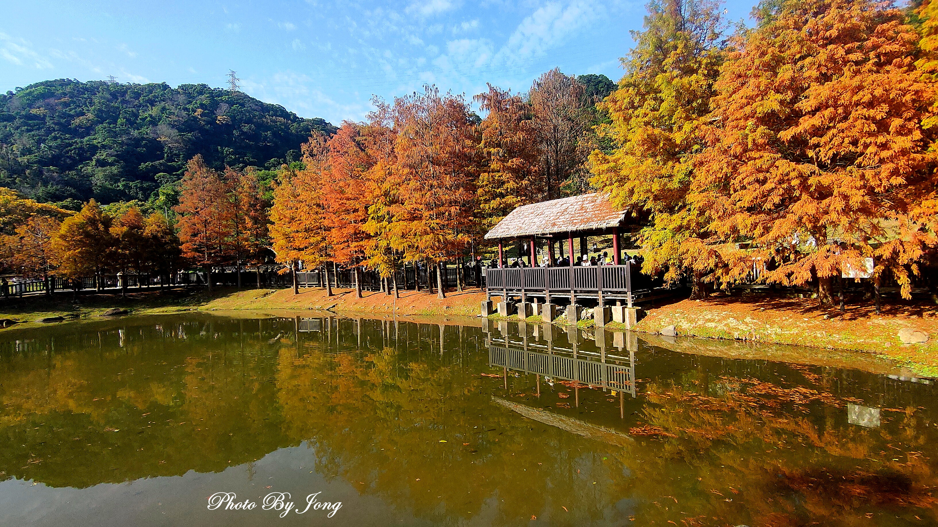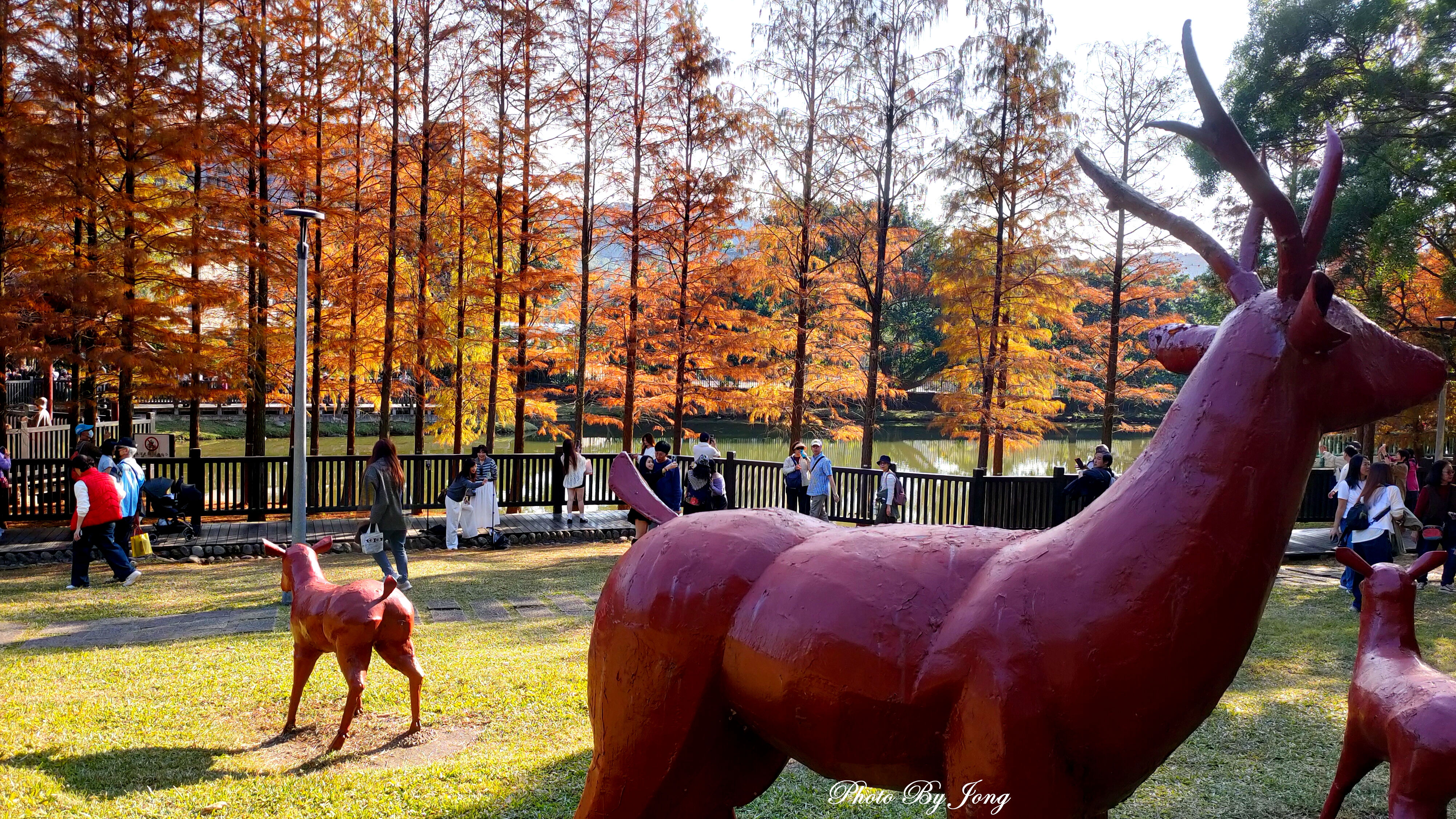 台北故宮旁的「原住民文化主題公園」冬日裡葉紅的落羽松,增添北國風情。