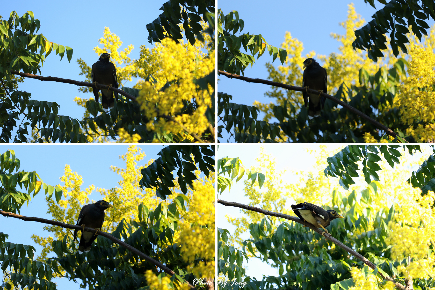 這場欒樹花開的盛宴,一起來湊熱鬧的不僅是昆蟲,鳥兒們似乎也沒有缺席。樹鵲不時的在不同株的欒樹叢間飛躍,嘎嘎的叫聲,彷彿有宣示地盤的味道;然而,同樣是肉食以捕獵小動物打響名號的大卷尾、伯勞鳥,也已分站在不同枝頭位置伺機而動。
