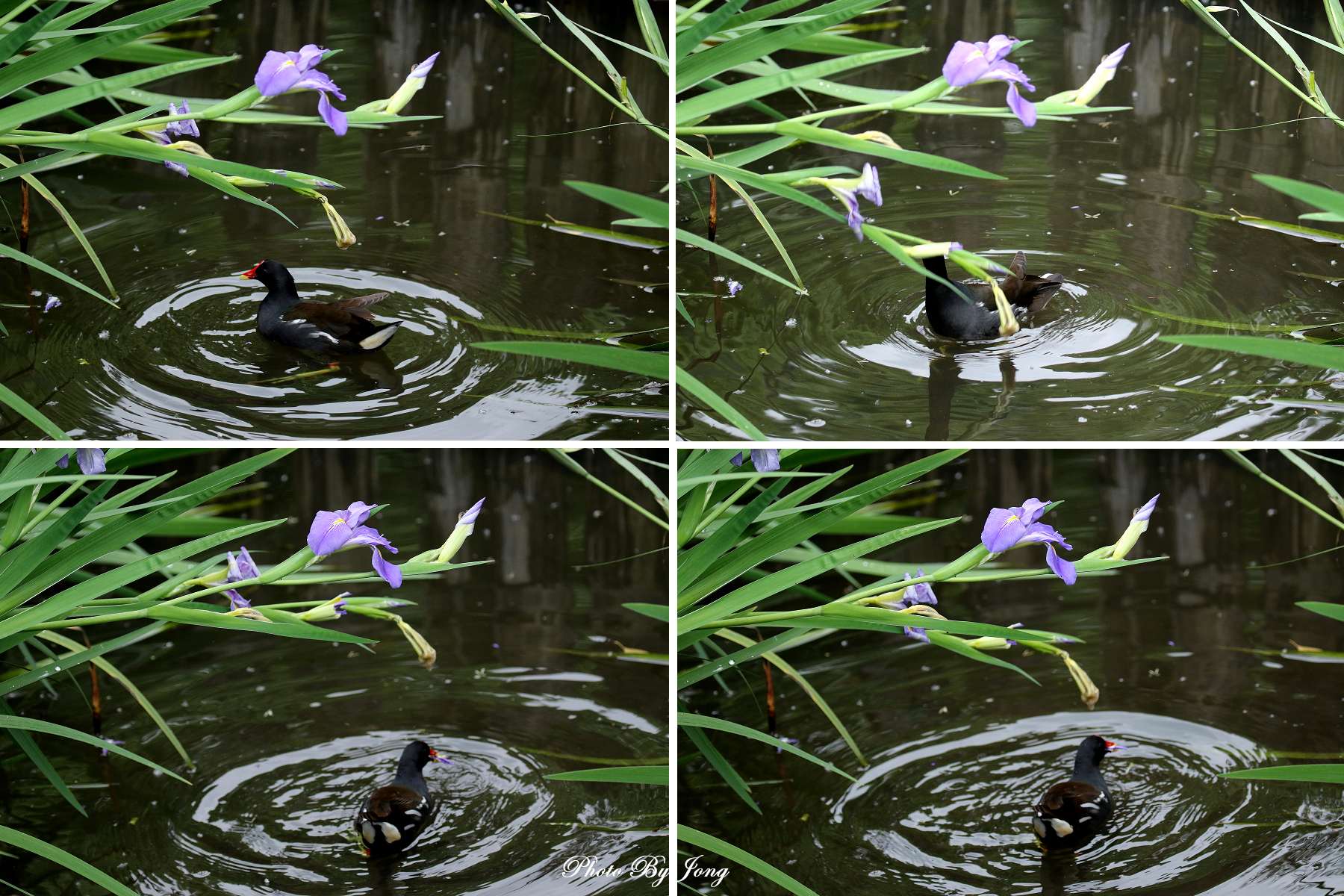 藍花大鳶尾+綠頭鴨+紅冠水雞+夜鷺+蚱蜢+樺斑蝶+朔果。