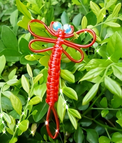 我也用膠管模仿中國結的編法,編了一隻紅色蜻蜓,共賞之。