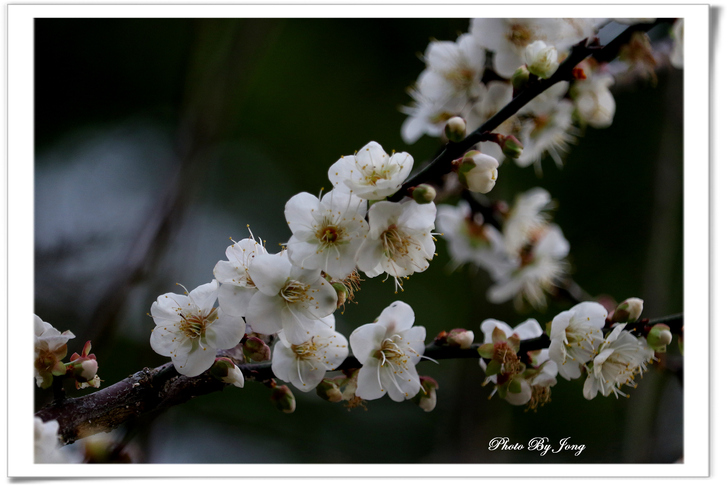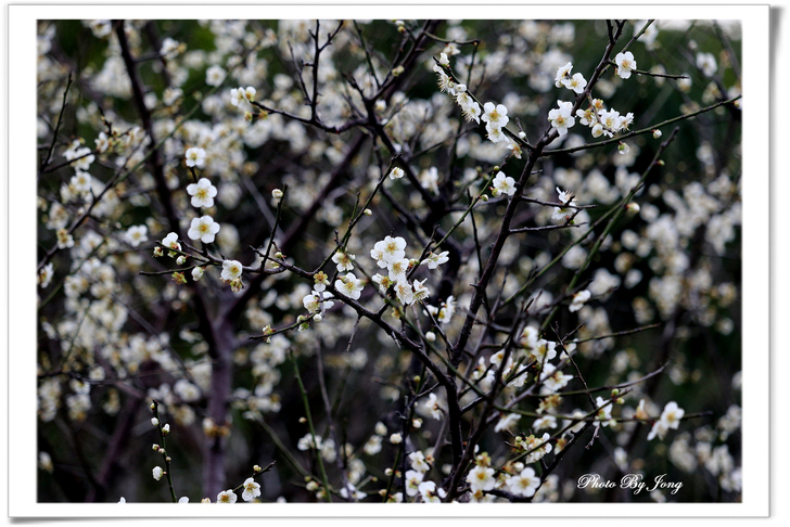 新年以來,北台灣陸續幾波寒流來襲,氣溫遽降,刮起寒風,天空還總是陰沉沉的飄著冷雨不斷。平日,這種溼溚溚的天氣,還真讓想出門到戶外活動的人怯步。好不容易天公作美放晴的日子,把握機會去了士林官邸、中正紀念堂等幾處,果然均發現了白梅枝間開花的花容。