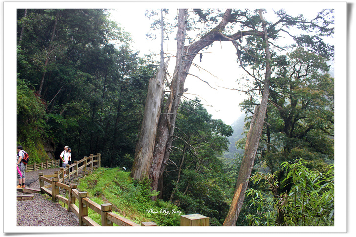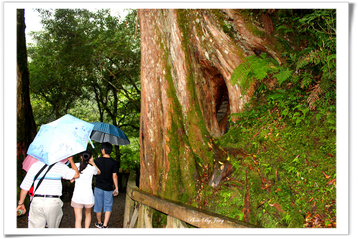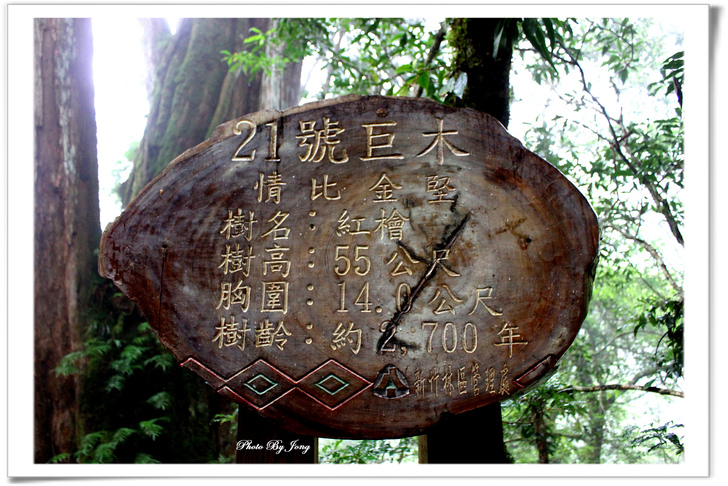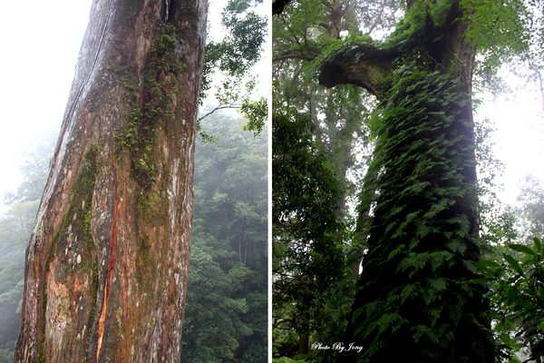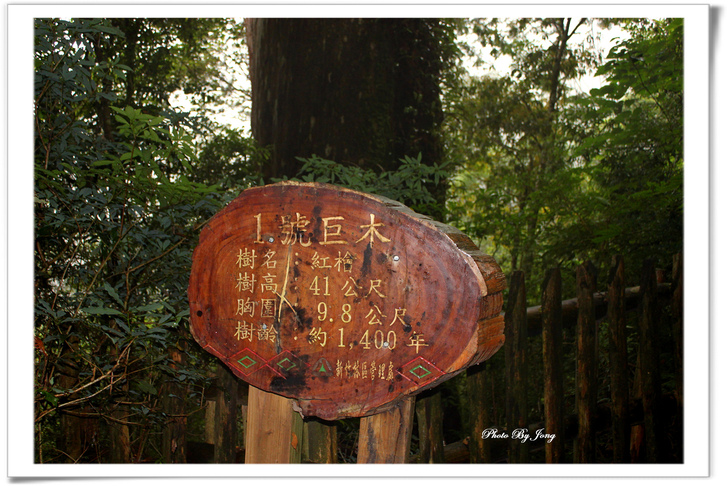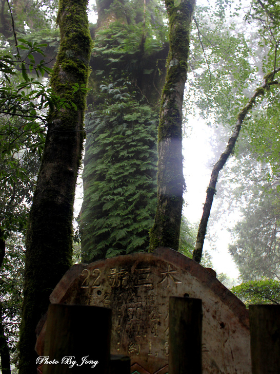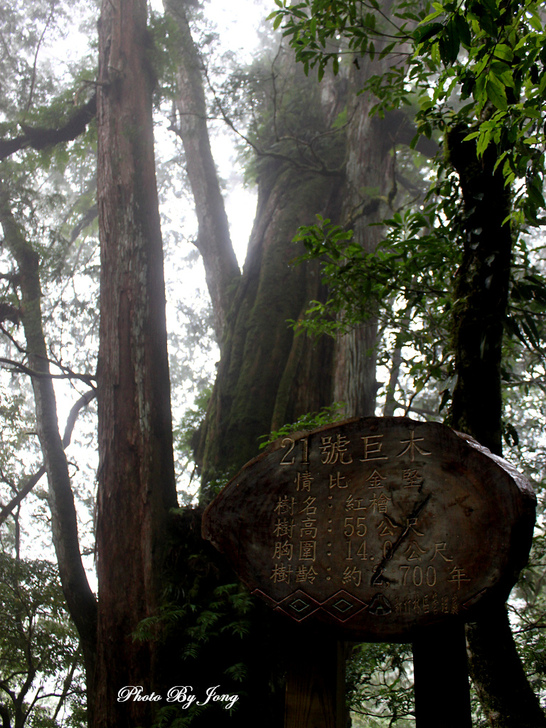 哇!編號共有24棵的巨木,除了9號名為<世代綿延>的樹種是扁柏,樹齡約440年外,其他23株的樹種都是紅檜,樹齡最小的是編號19號的<欣欣向榮>,樹齡也有500年;另外,還有編號6號的紅檜樹齡700年;其他的紅檜,樹齡均在千年以上,尤其是編號5<狗熊的窩>、21 <情比金堅>的樹齡,分別為2800年及2700年,更是巨木高齡中之最。望之龐然聳立,仰之彌高;不可思議,歷經幾百、上千年漫長的歲月,巨木們依然勃然挺立,且枝葉蓊鬱、欣欣向榮,豈能不讓人興起天地悠悠,嘆大自然造物的神奇?而個人生命如何短暫?確如百代之過客;在巍巍高山和巨木面前,真是渺滄海之一粟啊!