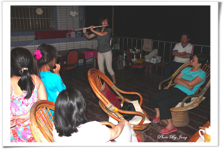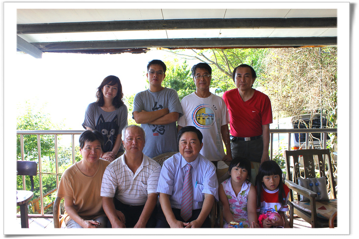 在<楓林農場>留影之一:晚餐後閒話家常,聽厚谷兄千金橫笛演奏;農場主人陳名今、林德妹學長夫婦,其他出席有:陳正毅(攜女)、王淺秋(攜女)、楊于謙(攜女)、陳厚谷(妻女未入鏡)、陳瑞中。