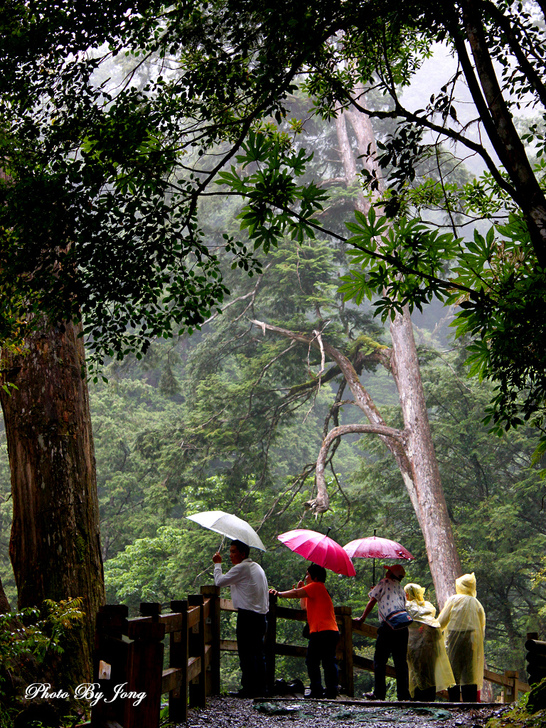 幸好,約半個鐘頭後,雨勢稍歇,只剩毛毛小雨,大家才撐著傘,一路挺進,逐一向巨木群頂禮致敬。