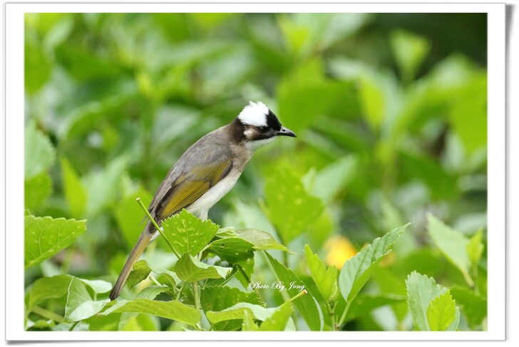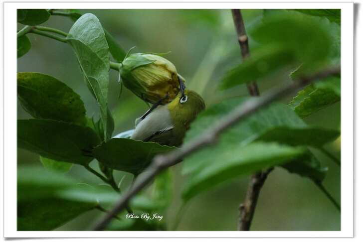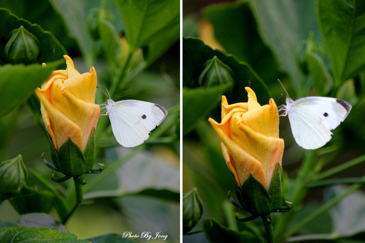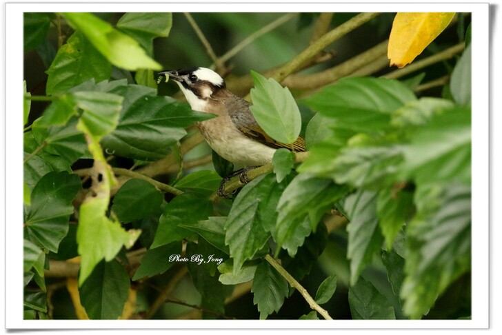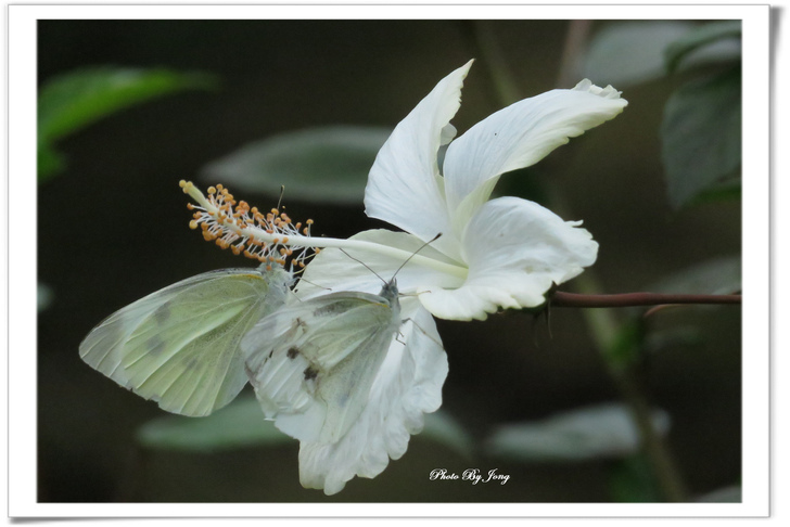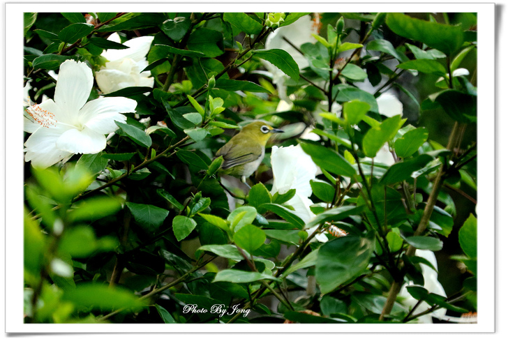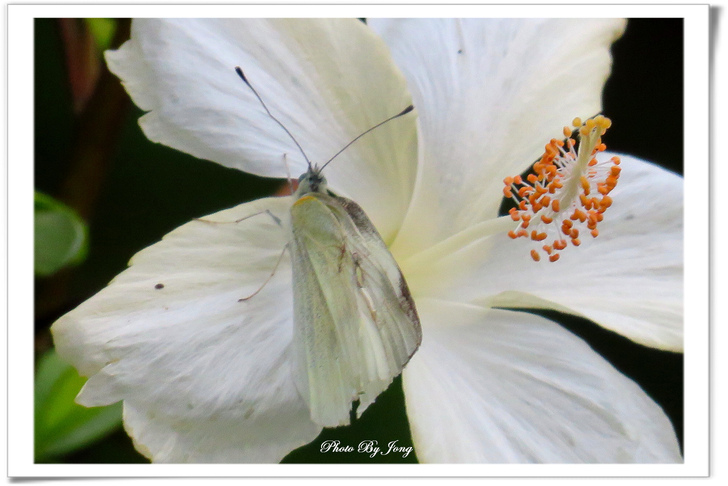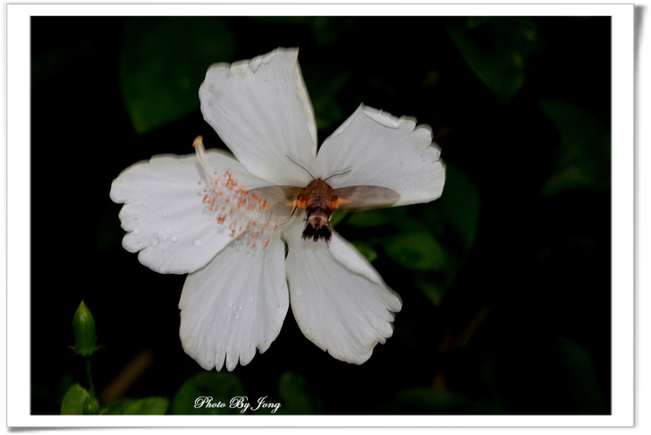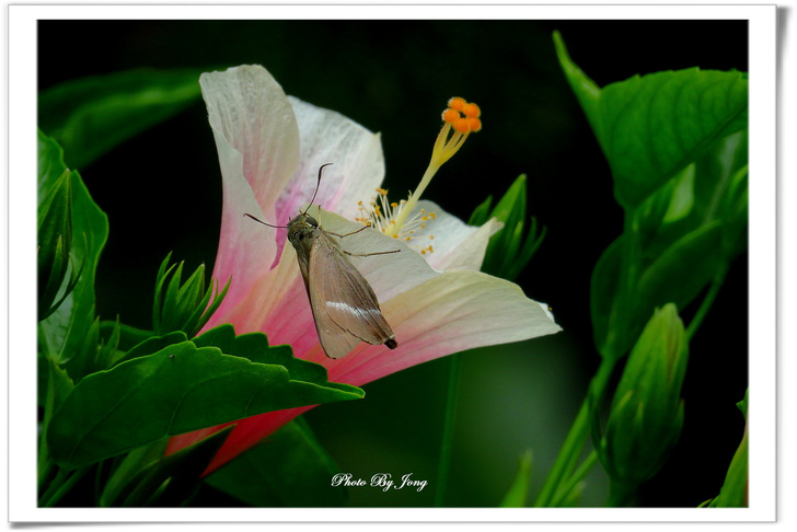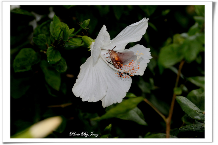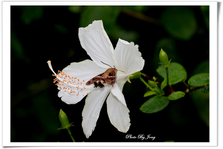 扶桑(朱槿)花葉+白粉蝶+小長喙天蛾+綠繡眼+白頭翁。