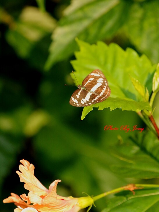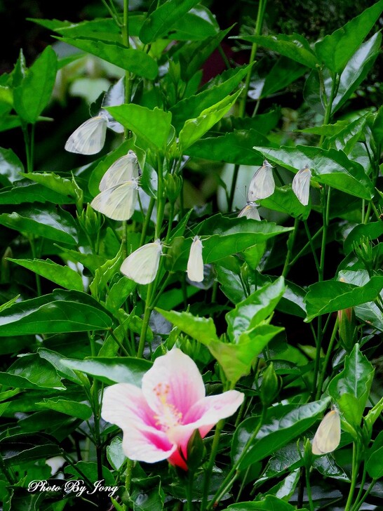 扶桑(朱槿)花+無紋黯弄蝶+尖翅絨弄蝶+小環蛺蝶+琉璃蛺蝶。