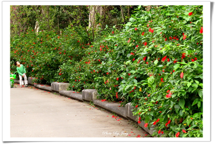 迄今,在台北眾多園區幾乎均可見到扶桑花及扶桑花圍籬,觸景生情,仍不免回想起南部屏東鄉下童年的一些往事吧!然而,賞花之餘,更樂在抓住扶桑(朱槿)花與蜂、蝶、鳥邂逅的機遇,留下美好的生態記錄。