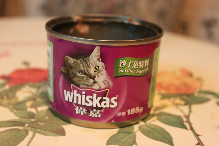兒子託了一個正要來訪的同學買了貓兒專屬的沙丁魚特餐罐頭給貓兒餵食。