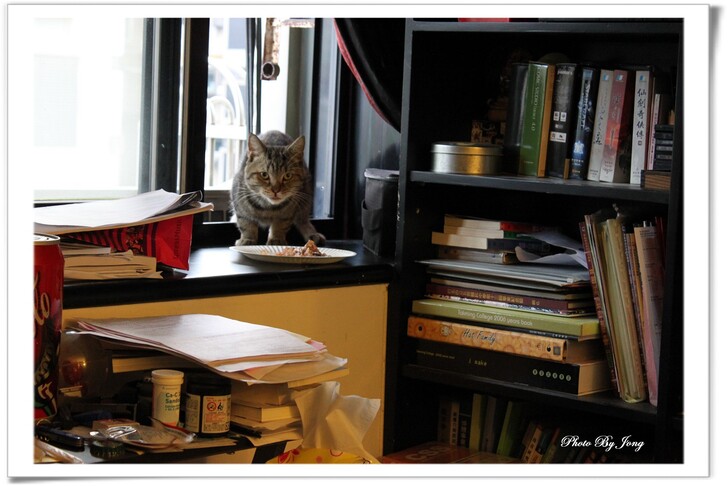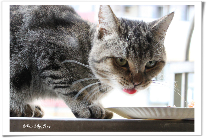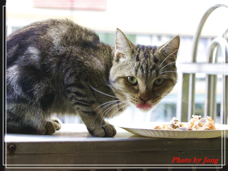 或許,這隻貓兒真的餓壞了。當兒子小心的打開窗將貓餐放在窗枱上時,貓兒僅有短暫的謹慎和猶豫,接著,就亳不客氣的享受牠的大餐了。