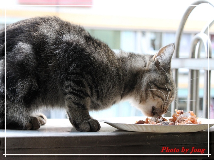 貓兒僅有短暫的謹慎和猶豫,接著,就亳不客氣的享受牠的大餐了。