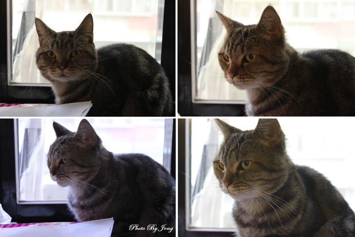 我們乾脆耐心的等牠吃完了沙丁魚特餐,又飲了幾口碗裏的水,牠吃飽喝足了,似乎顯得氣定神閒,接著,好整以暇的舔舐著自己的雙足,又慢慢的打理周身的皮毛。我則趁機給牠拍幾張近距離的特寫。這時,牠似乎已不太在意相機近身的特寫,反而一付老神在在的模樣。一度,牠把窗枱當做伸展台般,在上面輕巧曼妙踱步;甚至,還走下窗台,踏上了兒子的書桌,坐臥在他的電腦前,一付悠閒自在的模樣,真有「賓至如歸」的感覺。那種恬然自適的模樣-好溫馨,讓我有牠原本就是家裏的一份子的錯覺!
