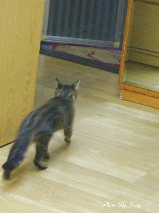我們並無刻意趕牠,只是把家裏其他房間的門關上,而把通往屋外的大門打開。於是,我們和貓之間像有了默契,牠像通靈一樣,從兒子的電腦桌跳下來,走進屋內,我們不動聲色的肅然站在一旁,然後,牠緩步經過客、餐廳,沉靜的、穩健的、似乎傲然的逐步向大門外走去;我和兒子及兒子的同學三個人,看著牠亳不留戀回顧的逕自走出門外,我才猛然想起對著牠的背影按下了快門。