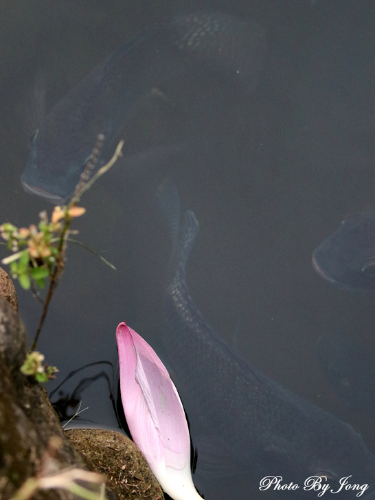 浮雲霞彩映池水。紅顏胭脂伴波光。