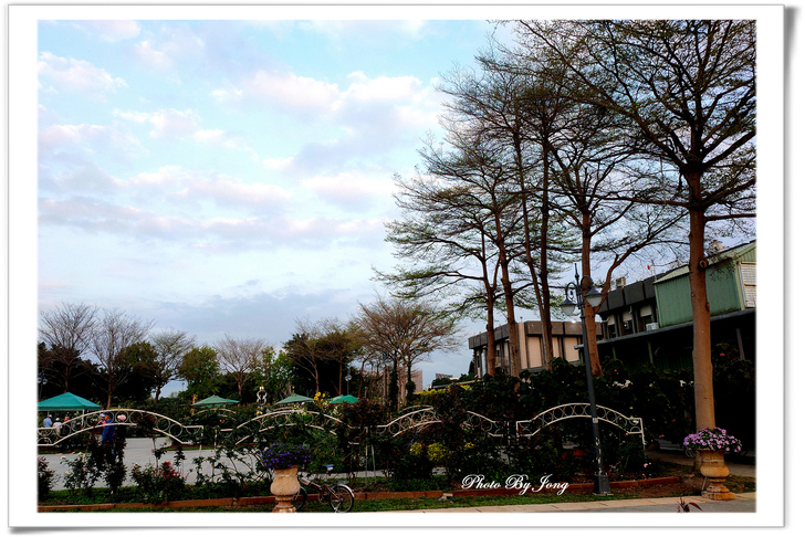 一,花海區:主要種植茶玫瑰及古典庭園玫瑰。(光之穹頂搭配盛開的玫瑰,被列為最佳拍攝點。旁走道栽種小葉欖仁正值枯枝發新芽期。)。