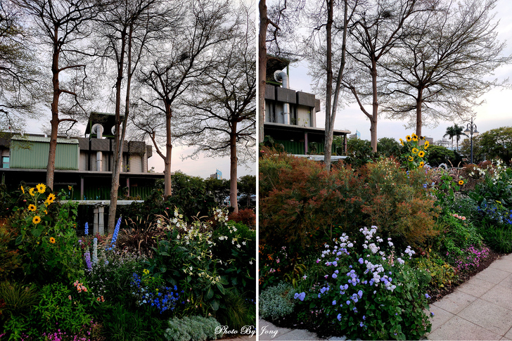 二,園藝植物佈展區:以自然式設計佈置各式多樣的花卉植物,營造出英式庭園的氣氛。(周邊栽植的非洲芙蓉正開花、小葉欖仁枝枯發新芽與花團錦簇的庭園相映,別有風味)。