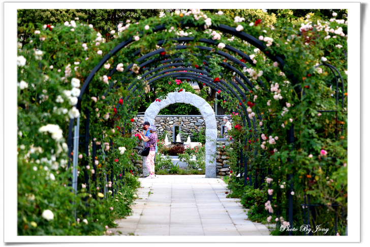 五,五彩玫瑰園:以顏色區分種植玫瑰,有紅、黃、白、紫、複色。(鋼架搭置的拱門,如攀滿玫瑰花時,必成遊園人留影的「熱門」最愛)。
