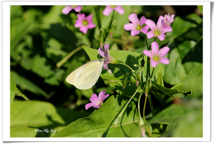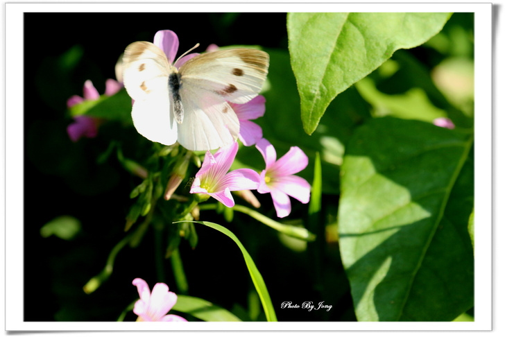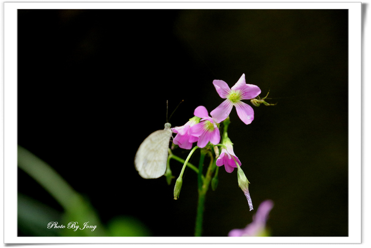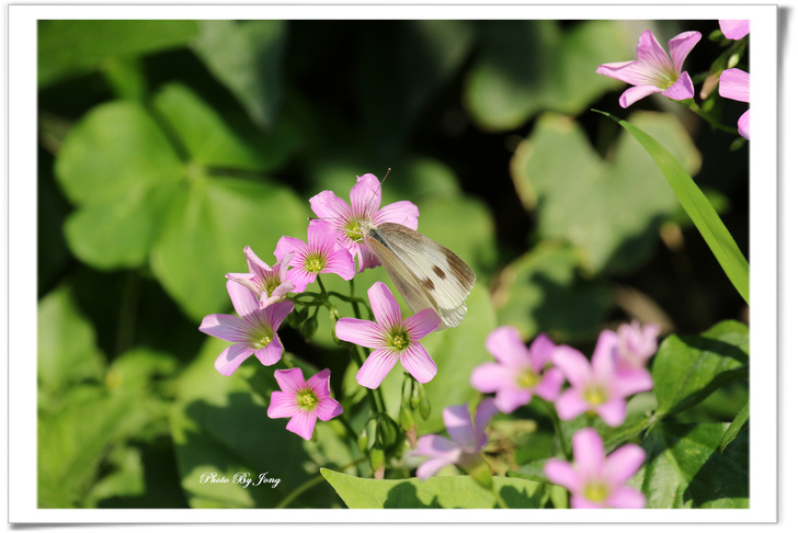 紫花酢漿草三出複葉,倒心臟形。花粉紅或紫紅色+白粉蝶+黑點粉蝶+蜘蛛。