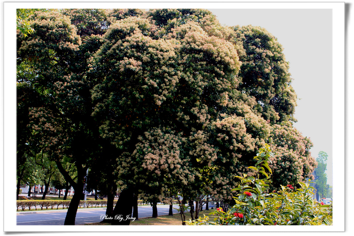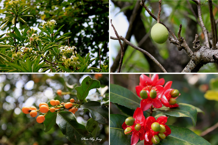 感覺屏科大的校園簡直就是一座全面綠化的大植物園林。走在樹蔭蓊鬱夾道、綠草如茵的校區步道,福木、松樹、楓香、樟樹、血桐、相思樹、火焰木、洋紅風鈴木、賽赤楠、海檬果、西印度醋栗、棋盤腳、荔枝林、芒果林、鳳梨田、玉蘭花樹等;沿途,還可見多樣化的花樹及圍籬,仙丹花、扶桑花、黃蝴蝶、美人蕉、紅葉朱蕉、蘭花、玫瑰、荷花、睡蓮、火筒樹、山柚子、紅尾鐵莧(紅毛莧)、龍船花…真是讓人賞心悅目。不少是可辨識的,還有更多是有待認識的植物。