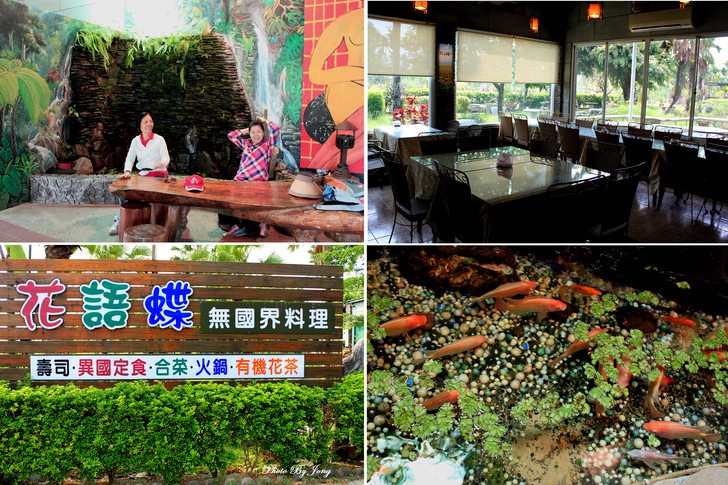 出了校門,校園外一條街,各種餐飲選擇很多。距離不遠處,我們選擇了<花語蝶>庭園餐廳,用餐還可享有庭園、魚池的清幽。
