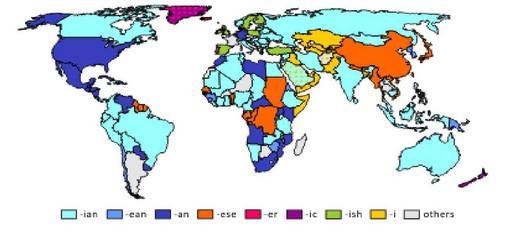 I fetched a list of nationality adjectives from NationMaster.com, then I started to color the world map according to the suffixes used to form their respective nationality adjectives. Finally I got this map: