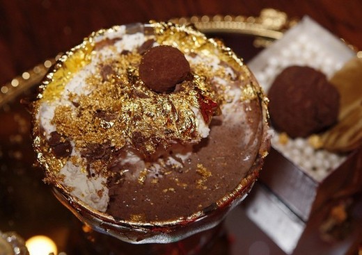 這款全球最貴甜品名為「Frrrozen Haute Chocolate」,鋪有5克23K食用金箔,加入14種來自非洲和南美最矜貴的可可粉調成的熱朱古力漿,另加奶、冰粒和28種可可粉攪拌30秒,然後再加上奶油及灑上全球最貴(2400美元1磅)的黑松露La Madeline au Truffle。這款甜品用Baccarat Harcourt水晶杯盛載,杯身配18K黃金與白鑽鐲子,並用價值1.4萬美元鑲寶石匙品嘗。