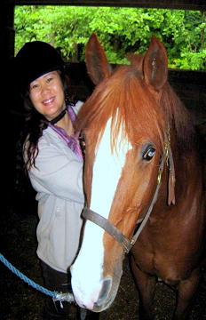 一身栗色毛、鼻子上一條白色斑紋的Shady小姐,可能不適應閃光燈,也可能嫌我這個新手刷得不夠好,不僅用力把我擠到牆壁邊,還用前腳跺地不停嘶鳴。看來下回要帶蘋果跟胡蘿蔔跟馬兒示好!