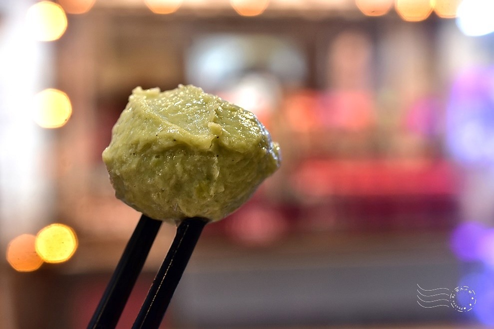 ↓綠色的是芹菜魚丸,淺紫色的是黑胡椒海陸丸,也就是花枝和豬肉混和的魚丸。