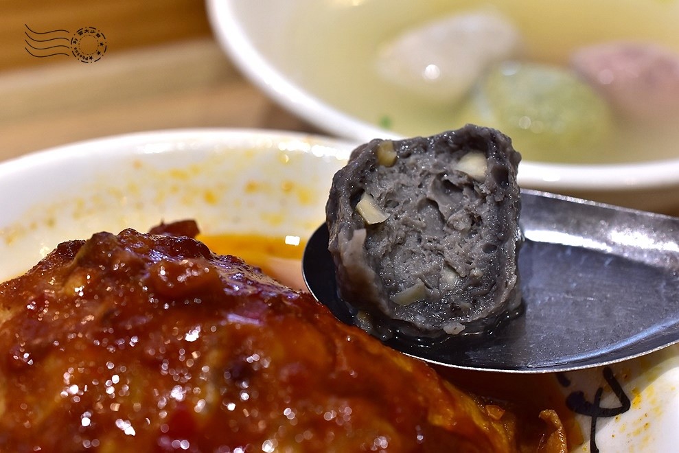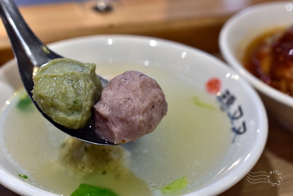 ↓又又五小福湯($50),一碗裡集合了五種不同口味的魚丸,就像開盲盒一樣,還能邊吃邊猜是哪種滋味。長橢圓形、白色的那顆倒是毫不神祕,一看就知道是包著肉餡的原味淡水魚丸。