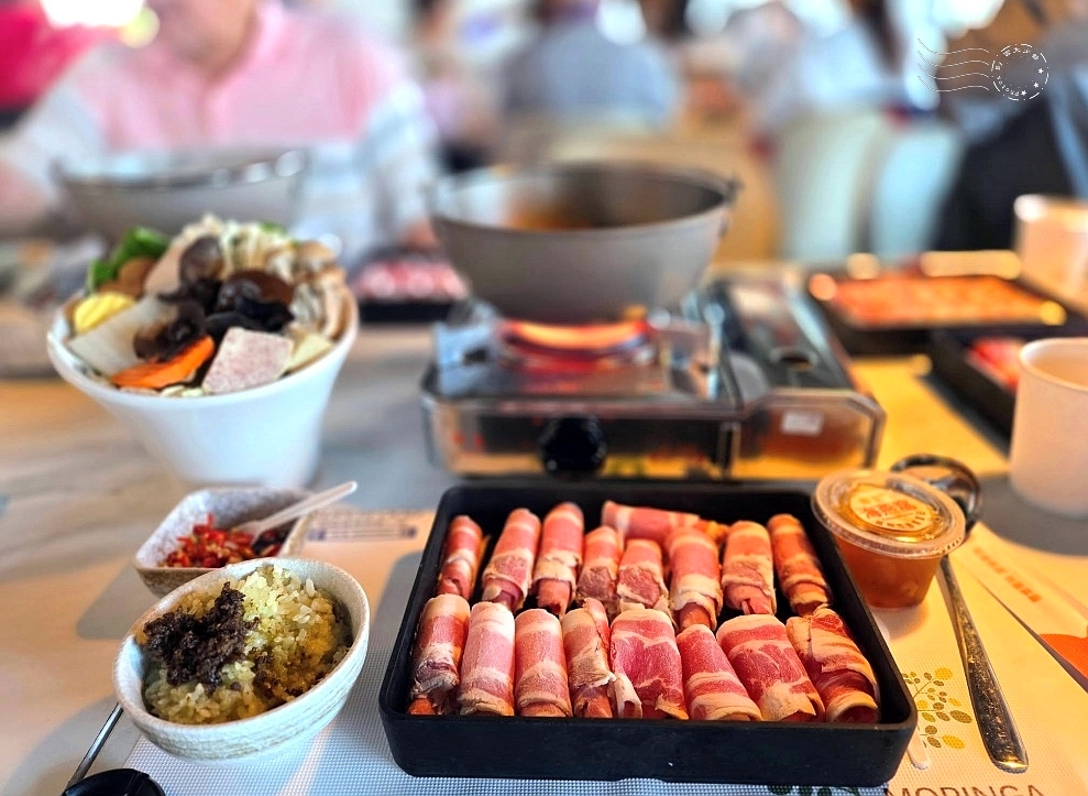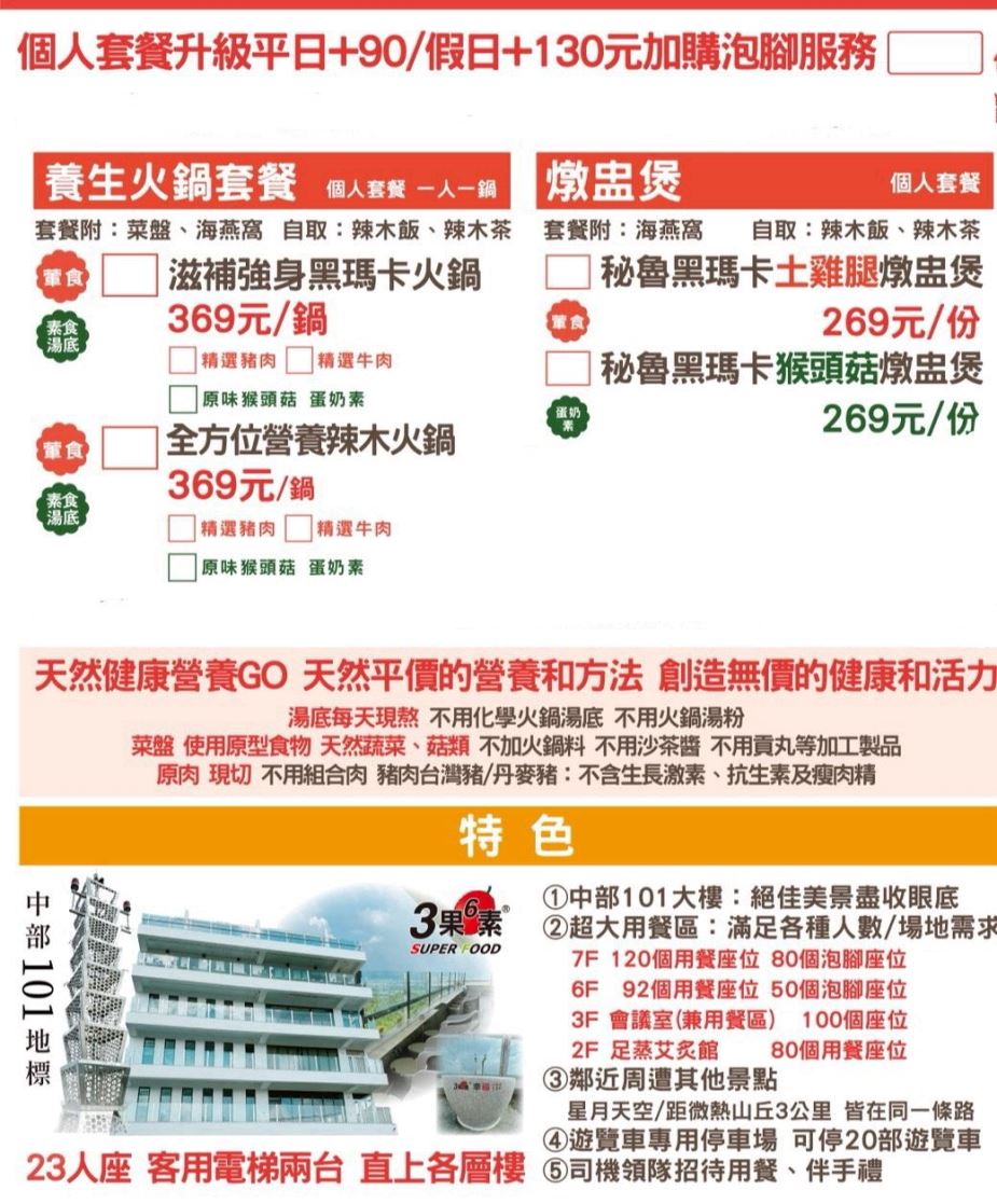 ↓菜單十分簡潔,僅有四款個人套餐,葷素皆可選擇。我點的是「滋補強身黑瑪卡火鍋」($369),選牛肉,一人一鍋。套餐附有菜盤與海燕窩,另有辣木飯、辣木茶與檸檬水可於自助區無限吃到飽。