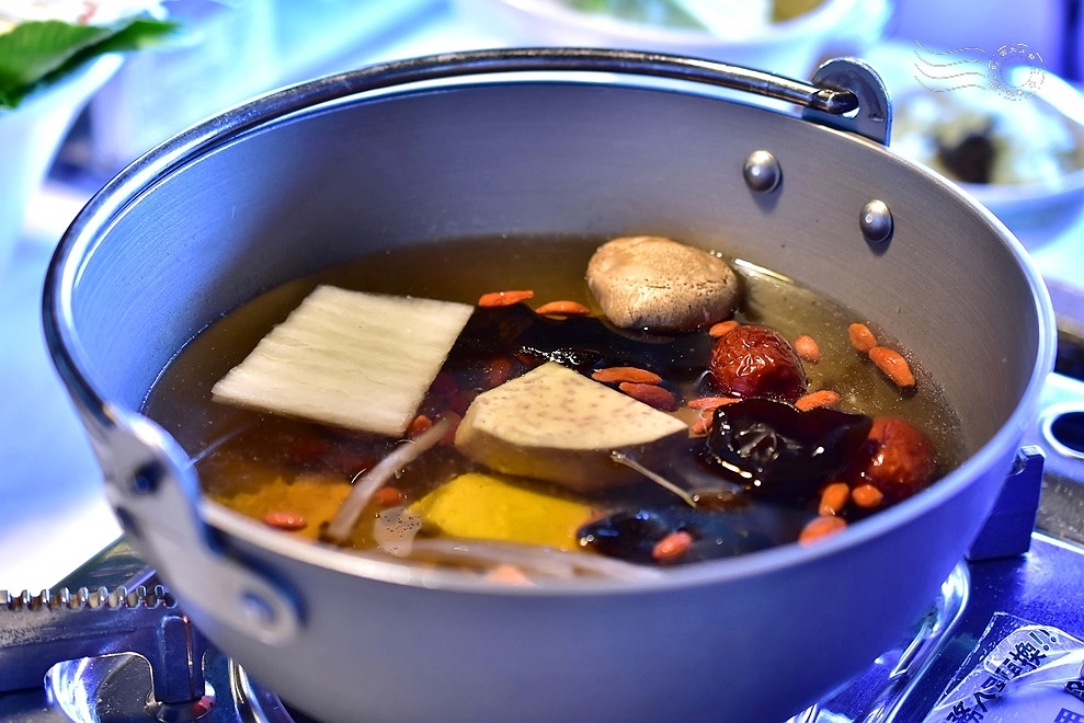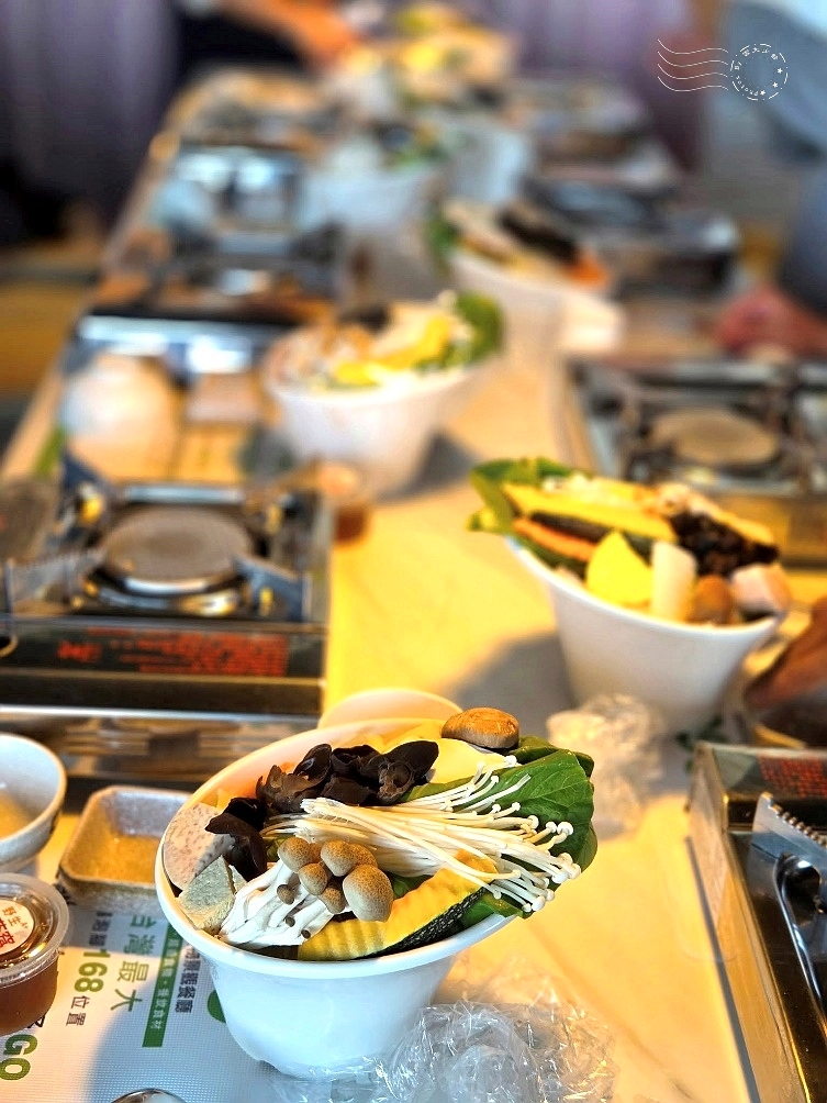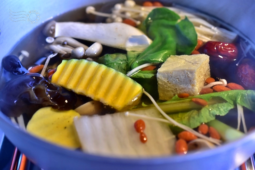 ↓菜盤包括金針菇、秀珍菇、南瓜、芋頭、黑木耳、百頁豆腐、青江菜和高麗菜,色澤自然、營養均衡。不用火鍋料、不用貢丸等加工製品。