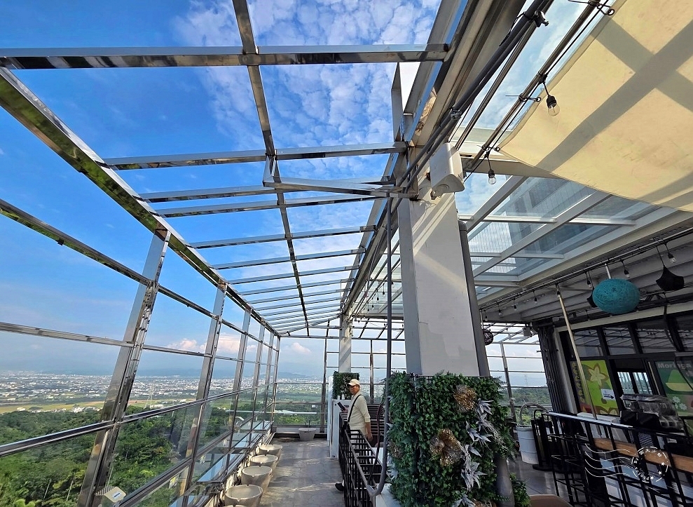 一般高樓的景觀餐廳多半設有落地玻璃窗,而【3果6素】卻以全然「透空」的設計呈現(當然還是有玻璃),彷彿少了界線的束縛,讓人有種化身成鳥、盡情環顧山巒與遠方城市的快感,那種暢快與開闊,令人忍不住深深呼吸。