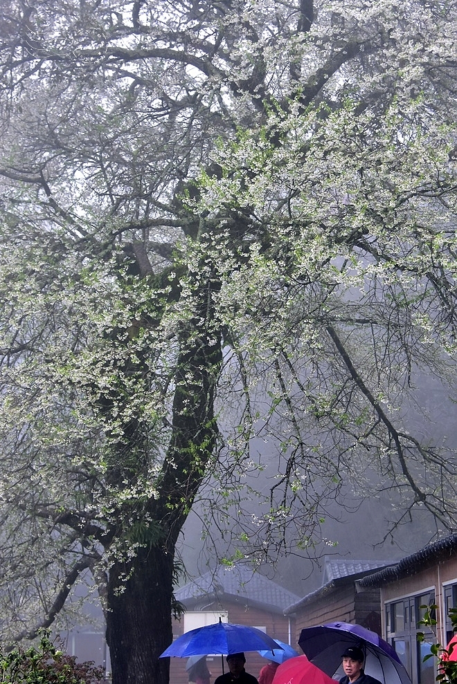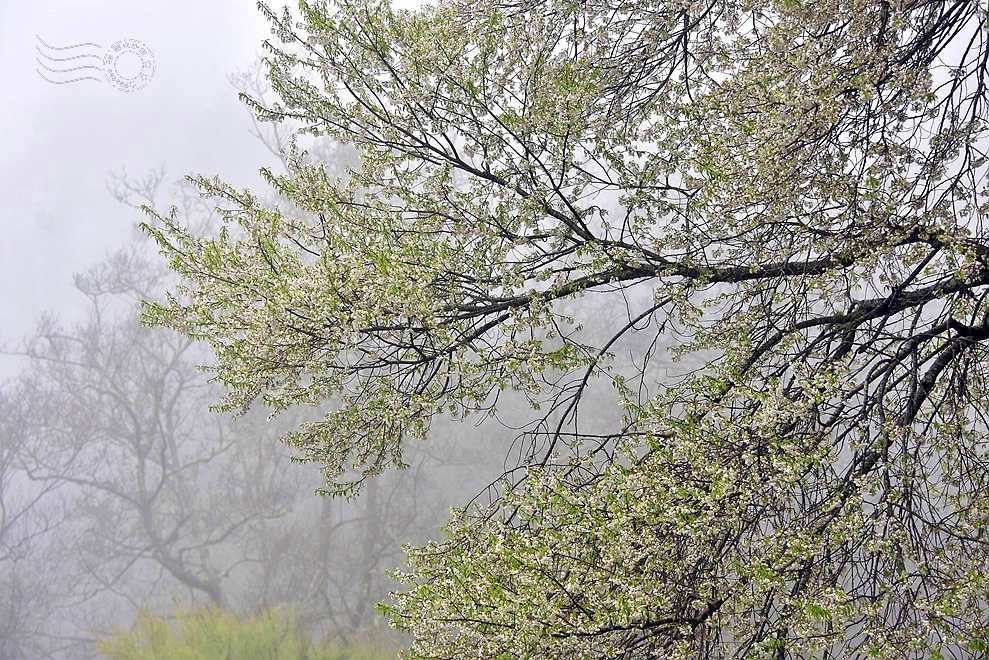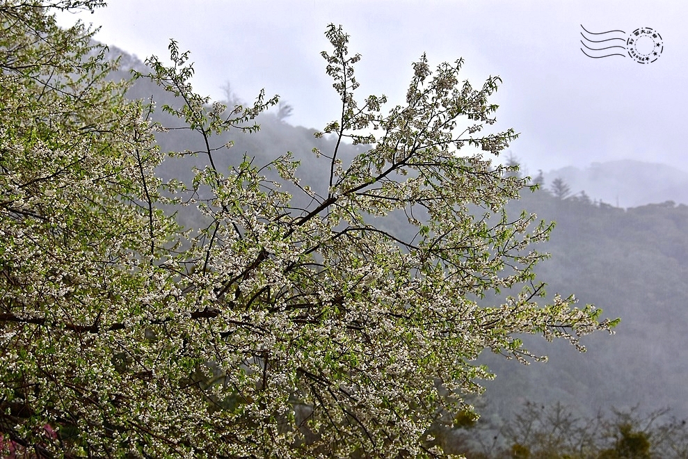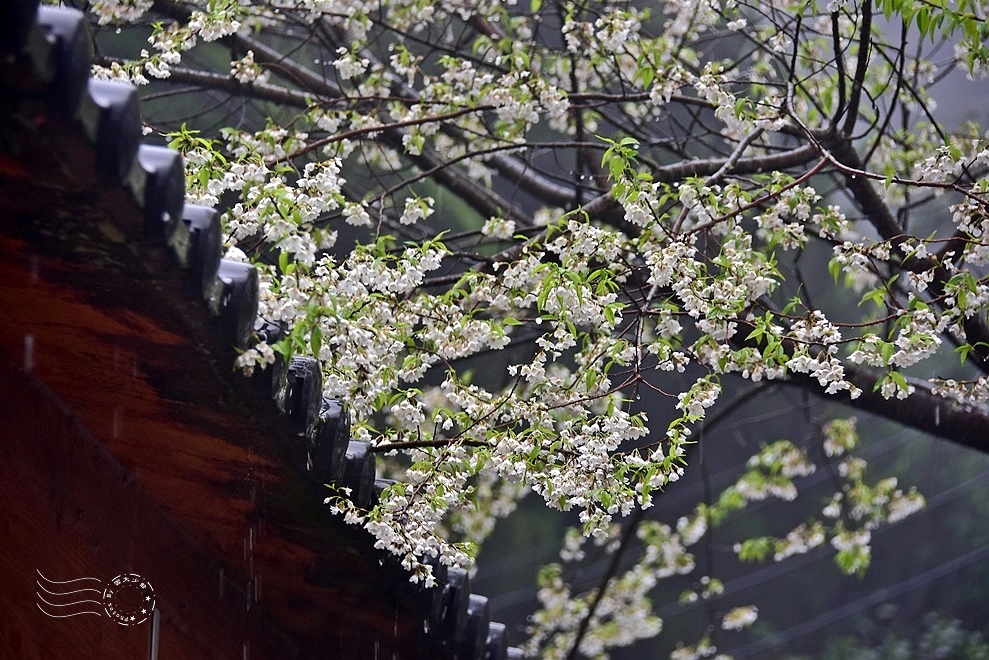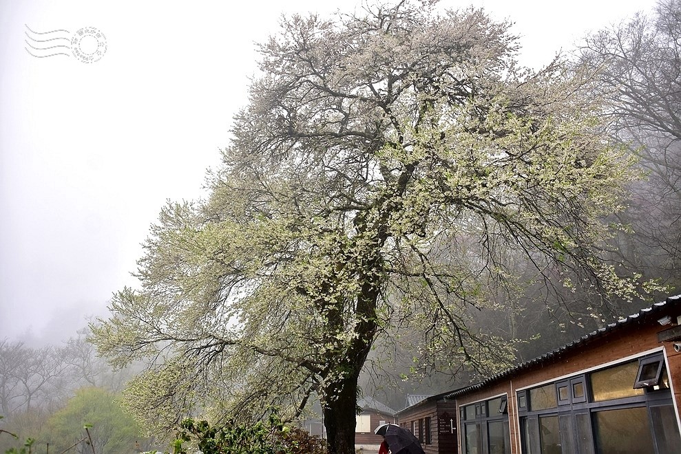 觀霧森林遊樂區位於新竹縣與苗栗縣交界處中高海拔的山區,終年都有雲霧繚繞,故有「觀霧」之美名。此刻滂沱大雨,霧氣濃重,滿開白花的櫻王,更充滿了神秘且浪漫的氣質。與其說如「三月雪」,卻更像透了光的冰霰。