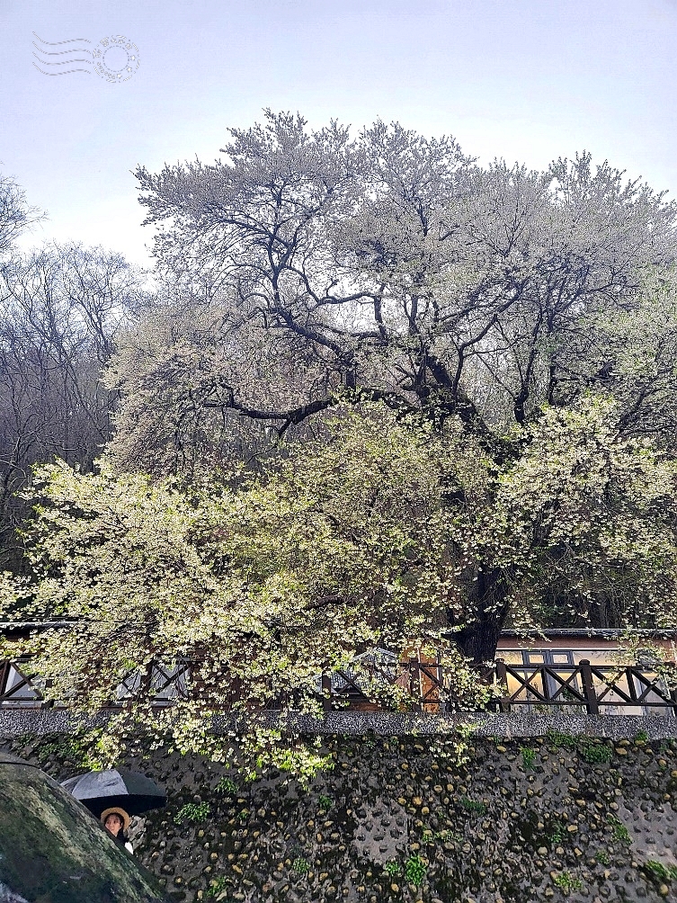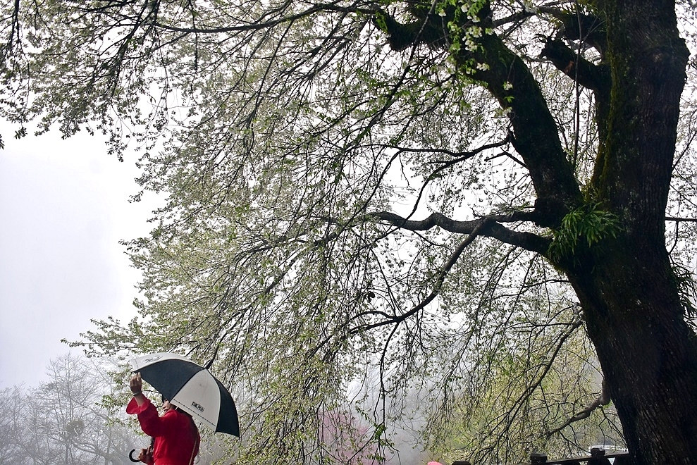 櫻王無畏風雨,遊客可沒這樣處變不驚了。我的相機鏡頭濕了又擦、擦了又濕,狼狽不堪,卻仍不願錯過這場初見之約。終究留下幾張影像,聊表對櫻王的敬仰。而更多的,則是對大自然的無限敬畏——只差沒向櫻神許願了。