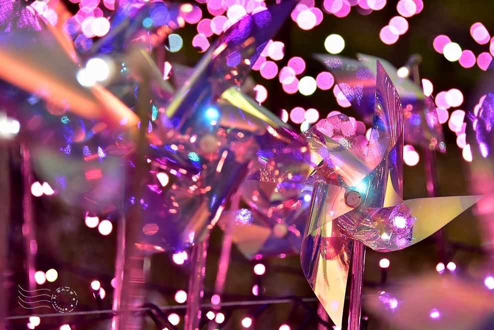 ↓發呆亭裝飾了雷射紙光澤風箏、藍與紫燈光,地面則鋪設了一支支粉紅風箏、粉紅燈泡,名為「煥彩花箏」。