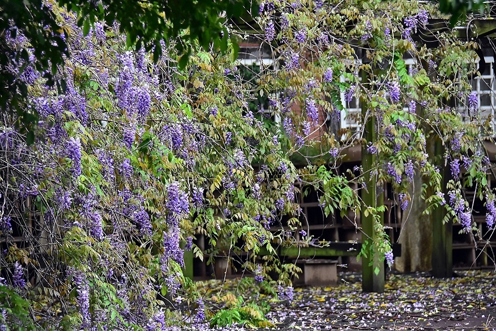 ↓終於見到串串紫藤花了!然而,不知是否受連日大雨影響,主棚架上的花朵很稀疏,大多盛開在外側斜垂的枝條上。意外呈現出一種荒煙漫草般的野性美,少了預期中的花瀑,卻多了分隨性灑脫。