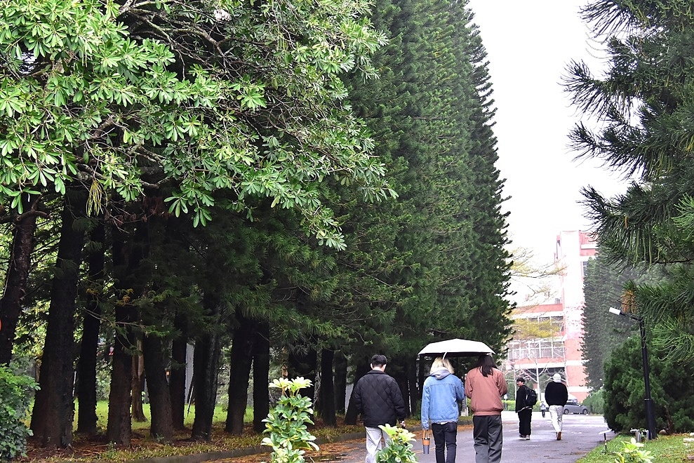 ↓踏入校園,映入眼簾的是筆直的林蔭主道,兩側南洋杉高聳整齊,宛如天然拱門。偶有學生穿梭其中,替這片綠意添上學術與青春的氣息。